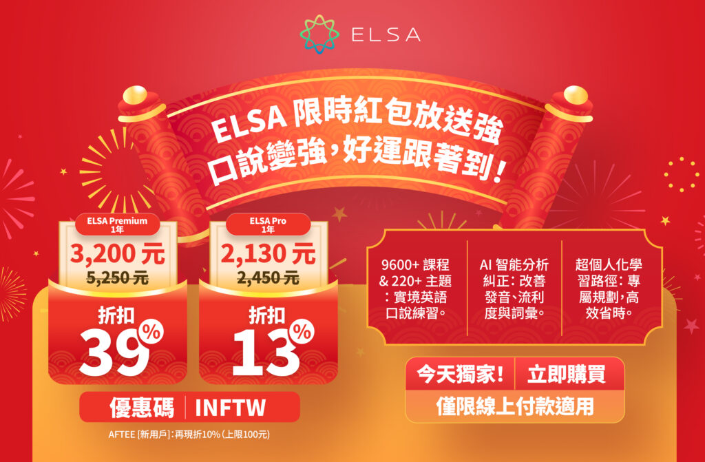 用 ELSA Speak,學習純正英語從未如此簡單!ELSA Pro 終身套餐讓您無限學習,終身提升英語能力!優惠時間僅限 2025 年 12 月,千萬別錯過這次超值優惠!
