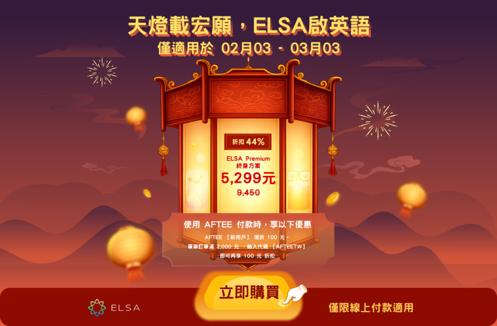 用 ELSA Speak,學習純正英語從未如此簡單!ELSA Pro 終身套餐讓您無限學習,終身提升英語能力!優惠時間僅限 2026 年 02 月,千萬別錯過這次超值優惠!