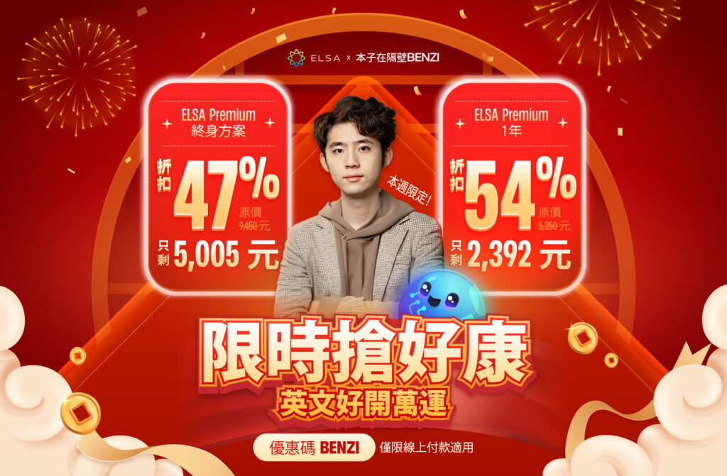 • 適用於所有用戶(不限新舊戶)購買 ELSA Speak 輸入折扣碼,結帳享 “3% 折扣”